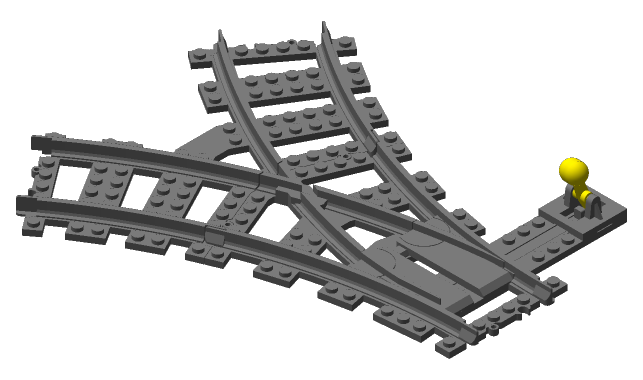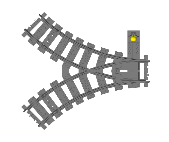 This is a wye switch for RC/PF LEGO® train layouts. It splits the main train into to two lines into two curved tracks.